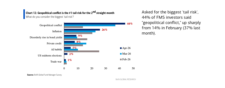 In terms of the three biggest “tail risks” seem by managers, in April, these were “Geopolitical conflict” (44% of those polled), “Inflation” (26%), and “Disorderly rise in bond yields” (9%).